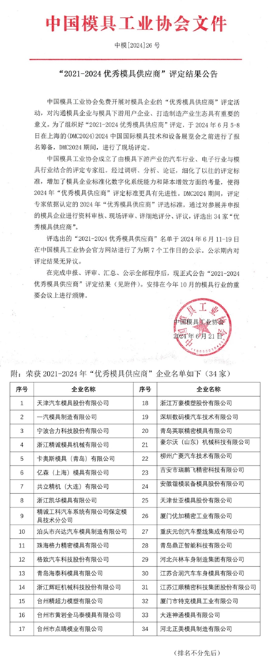 评定专家依据认定的2024年“优秀模具供应商”评选标准,通过对参展并申报的模具企业进行资料审核、现场评审、详细地评分、评议,评选出34家“优秀模具供应商”, 一汽模具荣获2021-2024优秀模具供应商。